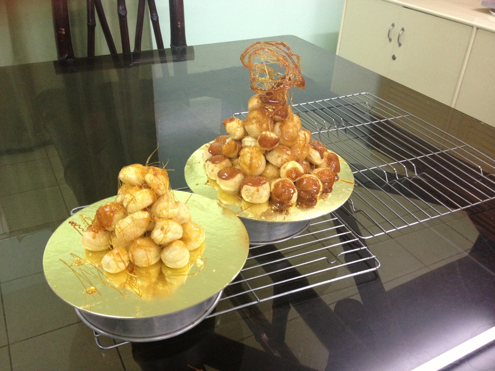 下は本日の課題、シュークリームとクロカンブッシュ、その応用の白鳥ケーキです。